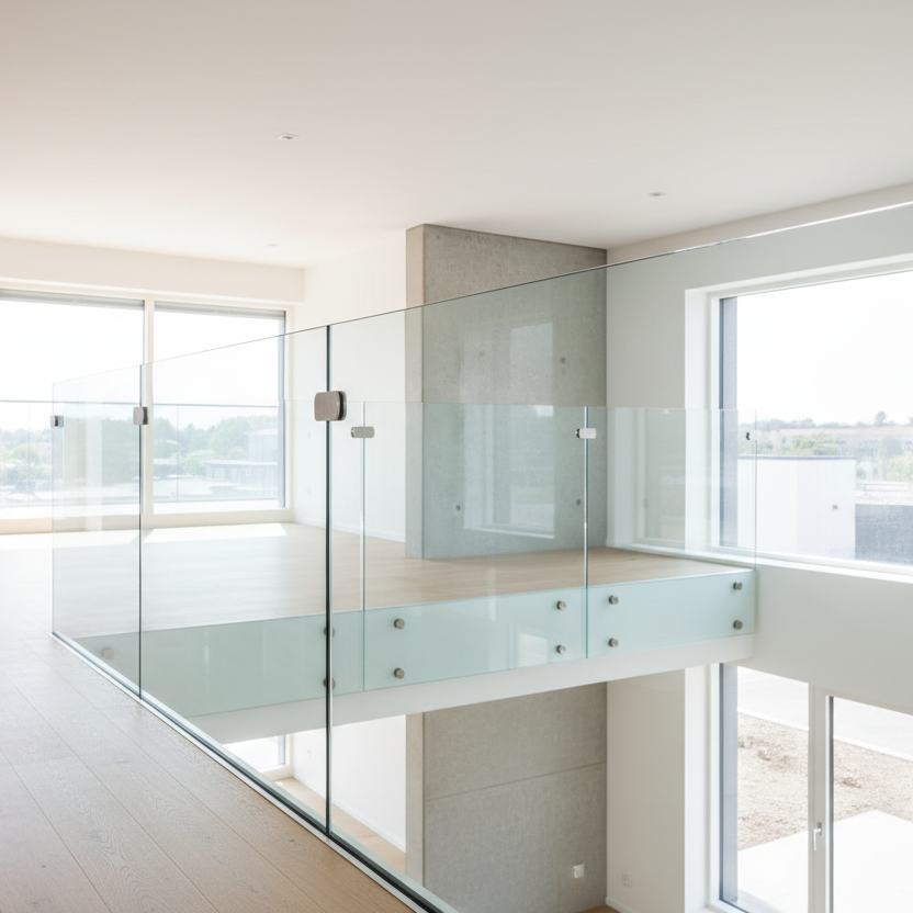 Lakossági korlátoknál általában 8+8 mm edzett-ragasztott biztonsági üveget használunk, a kiválasztott korlát típustól függően.